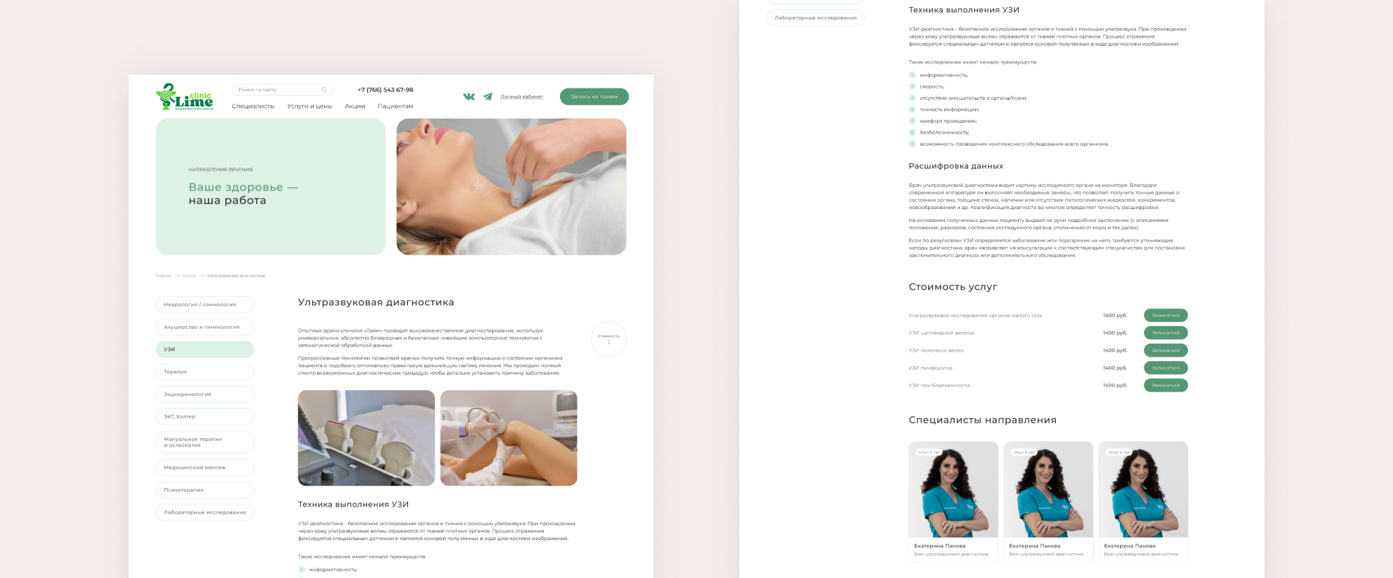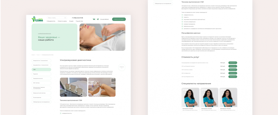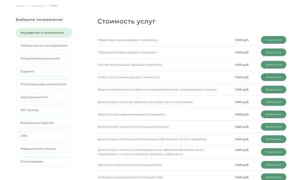 Страница «услуги» была оптимизирована для более удобного просмотра пользователями. Она включает в себя удобное боковое меню для быстрого перехода по категориям, описание, стоимость услуг по данной категории, а также список врачей по этому направлению. С этой страницы пользователь может записаться на нужную ему услугу.