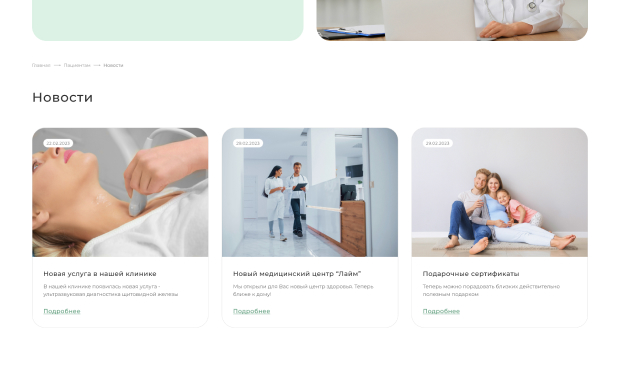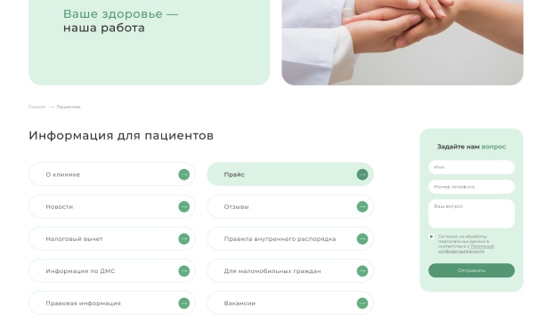 При разработке дизайна сайта нашей задачей было сделать удобный и понятный интерфейс для всех пользователей. Основными цветами нового сайта стали корпоративные цвета клиники. Зеленый благоприятно действует на нервную систему и успокаивает, так что это был отличный вариант для сайта медицинского учреждения.