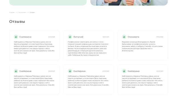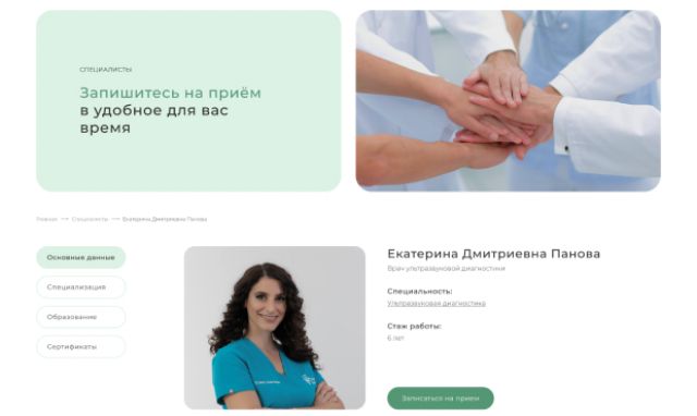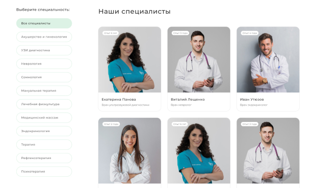 На данной странице размещены все специалисты медицинской клиники с опытом работы и их направлением для ознакомления пользователя перед посещением учреждения. Подобраны фотографии в одной цветовой гамме из эстетических соображений.
